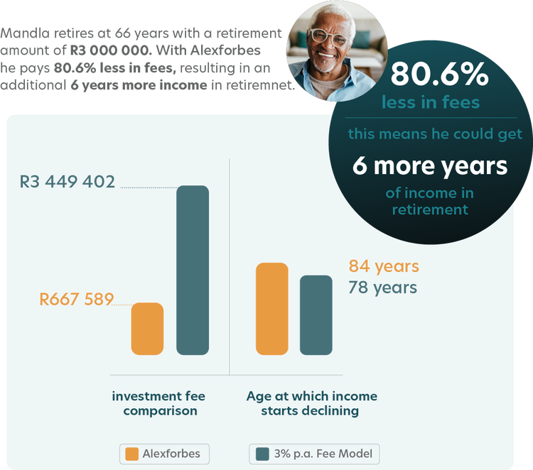 Profiles used are only for illustrative purposes. These figures include fees for advice, administration, fund management and other costs. We use the same return estimate when comparing investments applying a 3% fee model and an investment with Alexforbes Invest on various portfolio options, the only difference being the applicable fees. Modelling excludes the impact of taxes (including securities transfer tax). Research on fees was conducted by Alexforbes Invest internally. Past performance is not indicative of future performance. All investments are exposed to risk, not guaranteed and dependent on the performance of the underlying investments. Fees may change due to inflation.